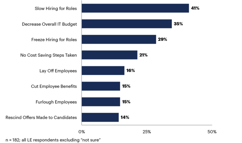 În timp ce CIOs doresc să-și extindă echipele de IT, mulți se confruntă cu obstacole în recrutare din cauza condițiilor economice. Din cauza volatilității economice predominante, 41% dintre CIOs ai companiilor mari raportează o încetinire a angajărilor în rolurile din domeniul IT, 35% raportează o scădere a bugetului total pentru IT și 29% raportează o blocare a angajărilor în domeniul IT (vezi Figura 1).